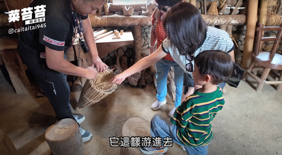菜苔苔一家人認識泰雅族捕魚工具-魚筌。(圖/翻攝自菜苔苔與菜生生Youtube)