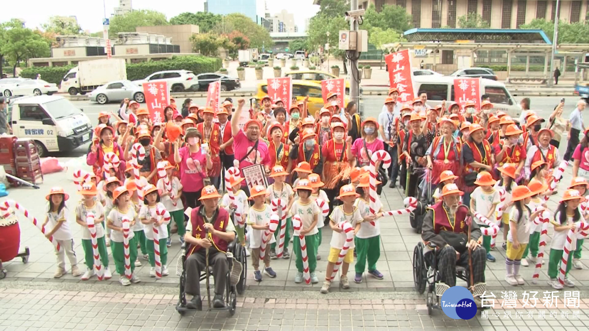 長輩們頭戴小學生「橘帽」,手持拐杖傘,在電音三太子的引導下跳起拐杖舞;幼兒園小朋友也到場聲援,呼籲大家用行動一起「愛老人」。