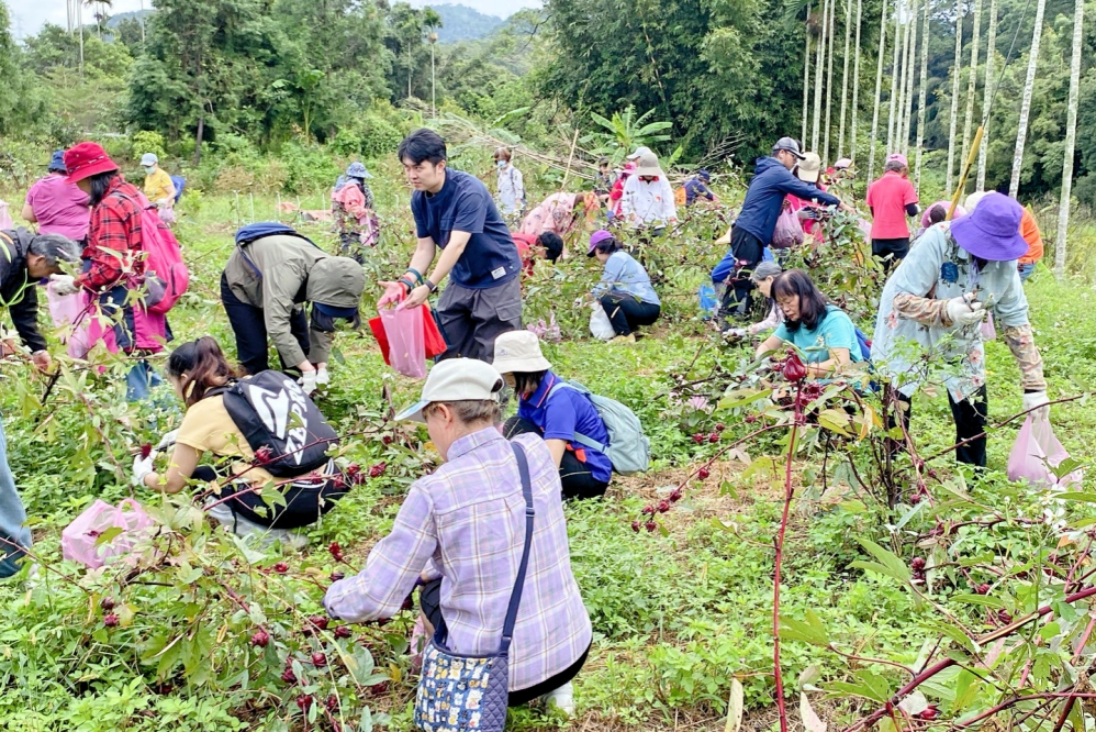 ▲新竹縣農會號召縣內10個鄉鎮區農會推廣部同仁,以及四健會、家政班、綠照班、產銷班及青年農民等約300人,一起協助拙茁家園採收洛神花。(圖/新竹縣農會提供)