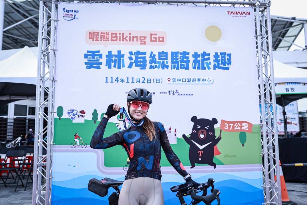 口湖遊客中心出發,途經多景點,全程37公里,沿途美景吸引眾多車友參與。(記者廖承恩翻攝)此次活動由雲嘉南管理處主辦,特別邀請來自土耳其的單車網紅「舒舒」(徐甘舒)領騎,沿途途經椬梧滯洪池、萡子寮喔熊藝術村、黑森林自行車道、金湖萬善爺廟、龍台宮及興安代天府1799驛站,全程約37公里,展現海線風光之美與人文故事。喔熊組長更現身帶領民眾暖身操,萌力全開,讓參與者驚呼連連、笑聲不斷。
