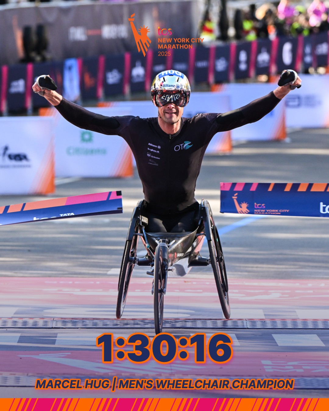 男子輪椅組,由綽號銀色子彈的瑞士名將 Marcel Hug 再次以 1:30:16 稱霸,為他的奪冠紀錄再添一筆,賽後他說:「能在紐約多次奪冠感覺太不真實,而且對我來說意義非凡。」他同時也入榜 Streakers and 15+(連續跑者和15次以上完賽者;目前有超過250名跑者保持連續或以上完賽紐約馬的紀錄)。