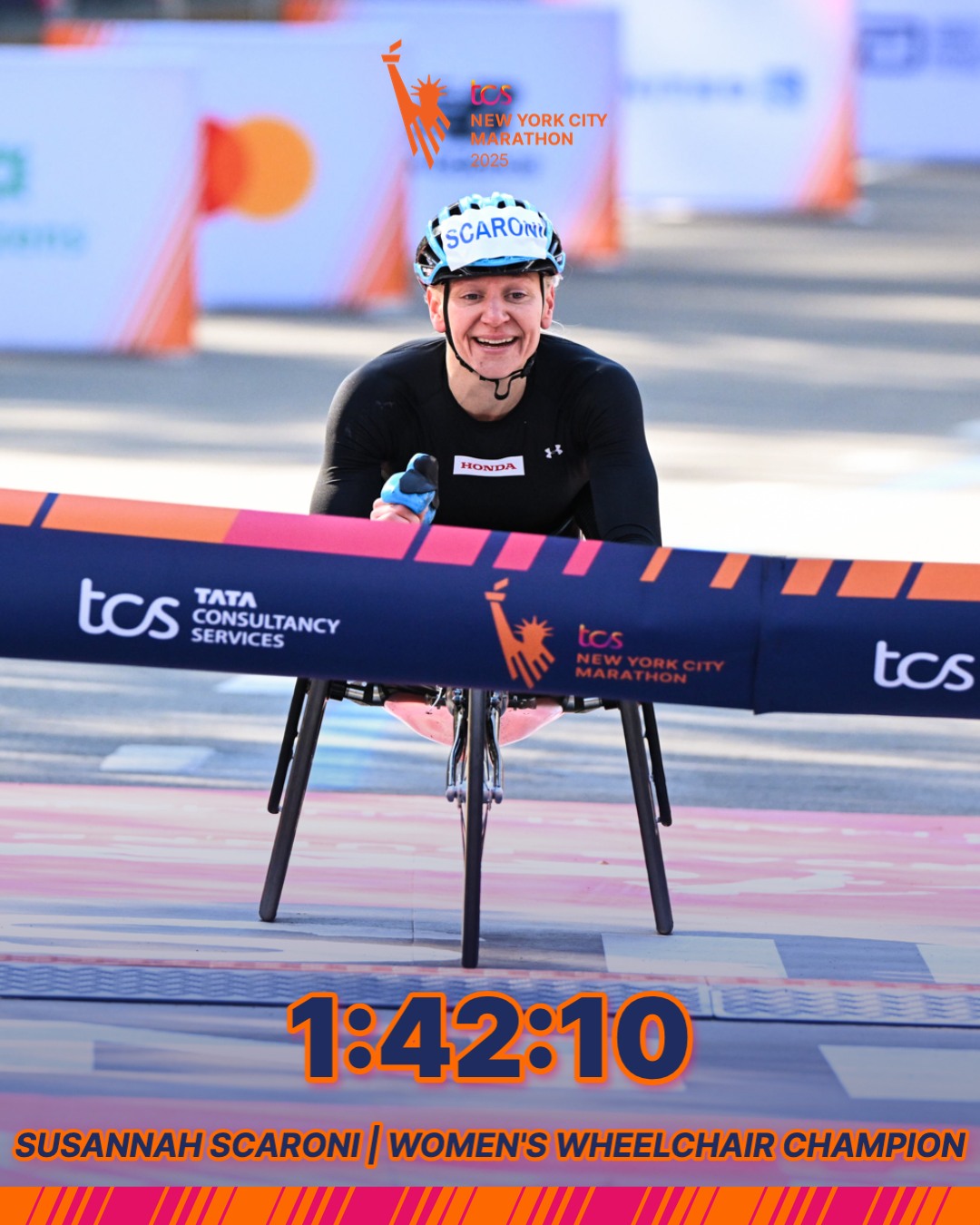 女子輪椅組則由 2023 及 2024 年冠軍 Susannah Scaroni 以 1:42:10 傲人成績再度蟬聯。她的賽事成績亮眼,此外她還曾拿下六次萬事達卡紐約迷你 10 公里賽冠軍,以及三次聯合航空紐約半馬的冠軍。她說:「這場賽事參賽人數眾多,幾乎能想到的選手齊聚,對我來說,能和這麼多精英說手同場競技是相當難能可貴的事。」