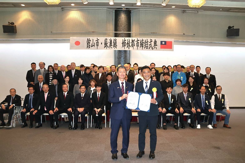 【記者 林明益/宜蘭 報導】由鎮長李明哲帶團的宜蘭縣蘇澳鎮國際交流訪問團,11月4日抵達日本千葉縣館山市。館山市長森正一親自率領市役所同仁,持青天白日滿地紅國旗熱情迎接蘇澳訪問團到來,雙方並正式簽盟為姊妹城鎮,包括館山商工會議所、館山觀光協會、館山國際交流協會、台日交流協會及在地台商多人出席觀禮,場面隆重。。