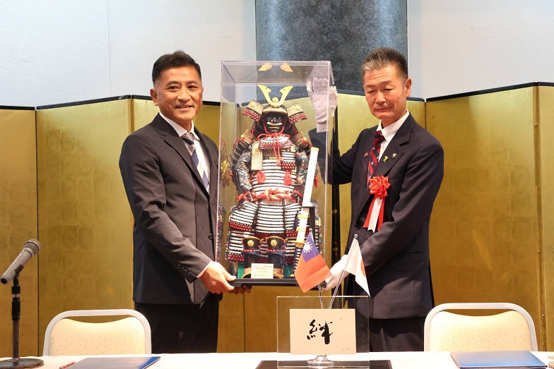 ▲蘇澳鎮長李明哲(左)接受館山市長森正一代表贈送的日本盔甲武士。館山市長森正一受訪時表示,館山最具魅力之處,在於有綿長的海岸線共有34.3公里,天晴時可於北条海岸遠眺富士山,除了與海為鄰,海產、海洋運動盛行,伏姬牛(和牛)、本地日本萵苣、伊勢龍蝦也是日本首屈一指。館山物產希望透過蘇澳作為窗口,進入台灣,讓更多台灣民眾看見館山之美。而森市長本人,最期待親自造訪蘇澳,參與蘇澳年度運動盛事「蘇花馬拉松」大賽。