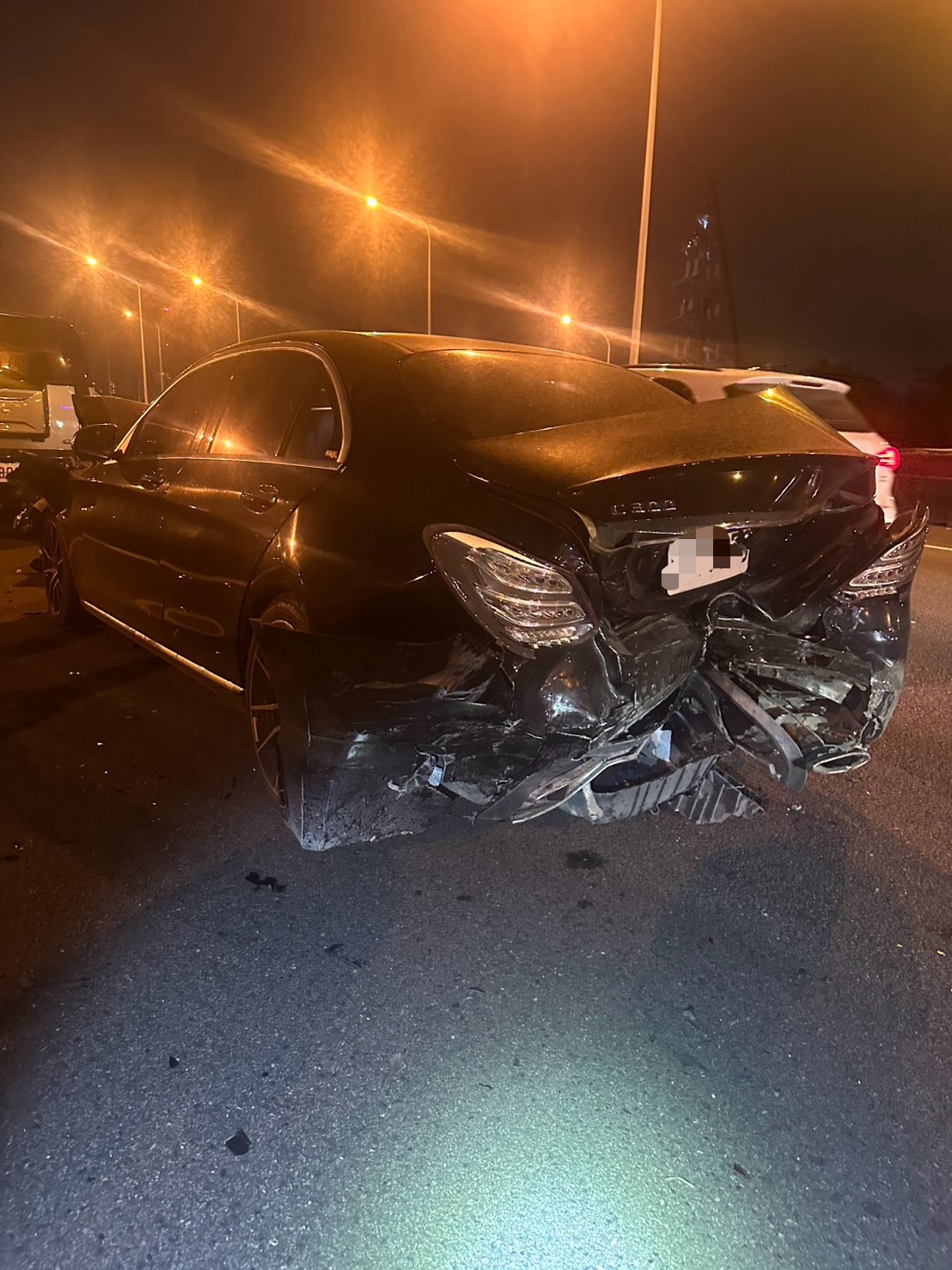 ▲三車碰撞的其中一輛賓士車,車尾嚴重損毀。(圖/翻攝畫面)