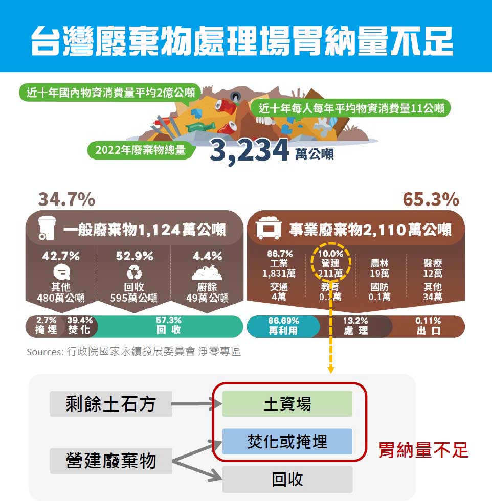 然而這場「土方之亂」,正揭開了台灣營建廢棄物長年無法消化的現實。易境永續指出,在台灣,不可回收的垃圾多以焚化處理(約39.4%)為主,掩埋場則幾近飽和;事業廢棄物中,營建廢棄物約占10%,又可細分為「剩餘土石方」與「營建廢棄物」。由於土資場與掩埋、焚化設施皆面臨胃納量不足問題,讓「土方無處可去」成為全國性的瓶頸。當缺口擴大,非法棄置與跨縣市偷倒便有了市場。