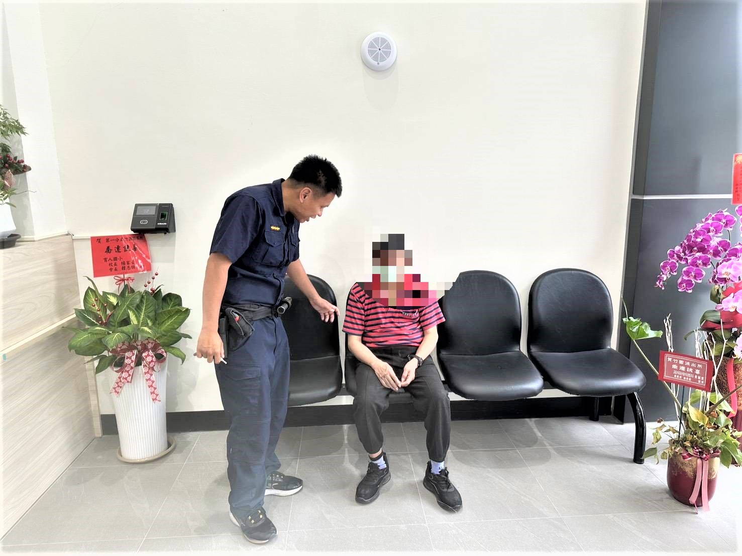員警先安撫林翁不安情緒,檢視身體狀況有無受傷,幸好並無大礙,耐心詢問年籍資料並積極聯繫養護之家人員,員警考量當時天候炎熱,且林翁精神狀況已顯疲憊,攙扶上巡邏車帶返派出所照護;養護之家人員接獲通知後,非常驚喜連忙趕往派出所並表示,林翁本身患有輕度失智,活動會場結束林翁自行離開,養護之家人員遍尋不著,焦急之際接獲尋獲通知,對警方即時協助與貼心照護民眾安全之精神,深表感謝。