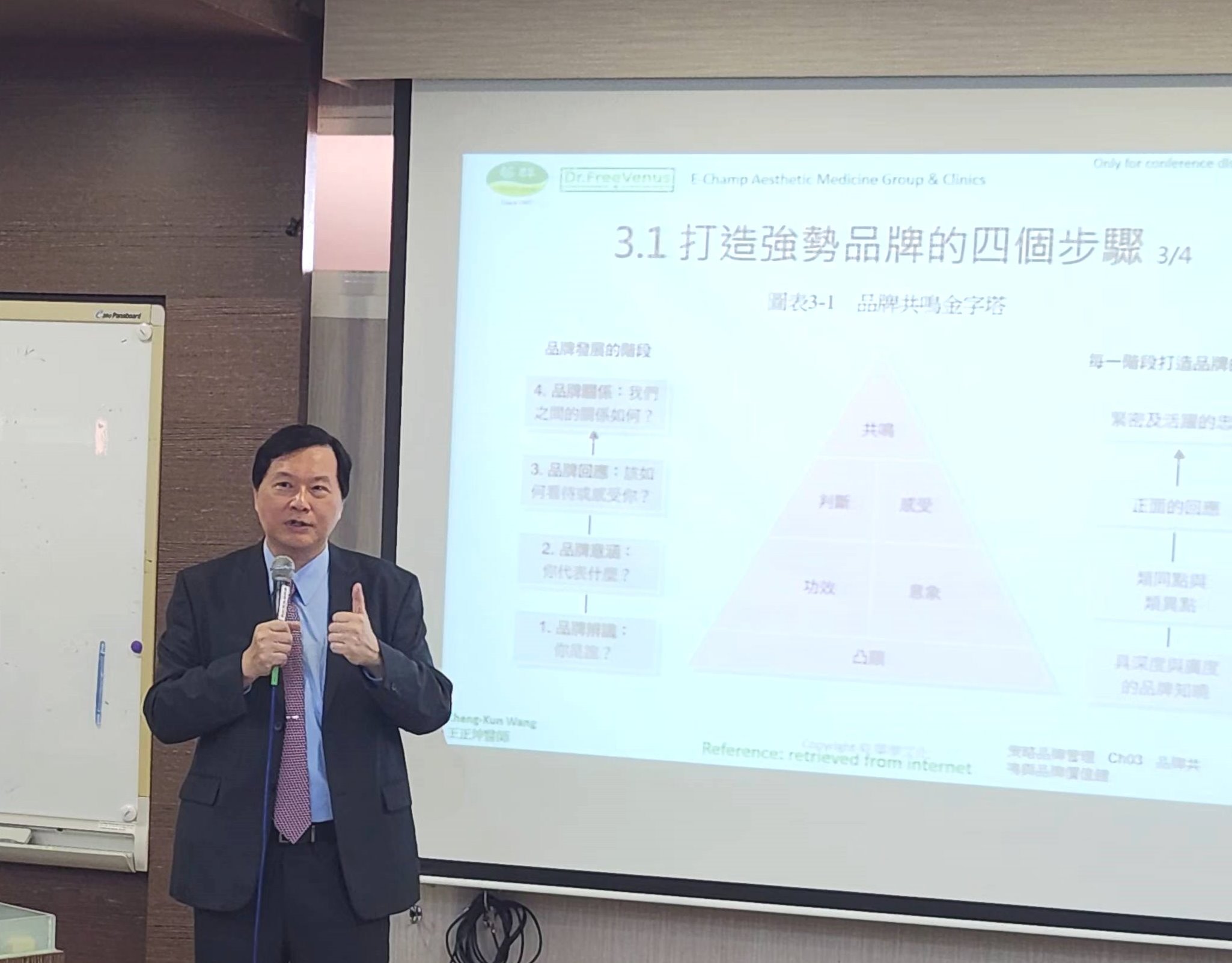 王正坤醫師指出,關於品牌金字塔(Brand Pyramid),最重要的成果就是「品牌共鳴」(Brand Resonance),任何企業若想打造「品牌」,可以從品牌金字塔著手,金字塔的底層是品牌凸顯,然後依照產品的功能性價值與情感價值,逐步提升到消費者共鳴,產生品牌忠誠度,功能性價值是指產品能夠穩定供應、品質可靠、價格合理;情感價值是指品牌與消費者建立情感連結、創造體驗記憶,品牌金字塔頂端則是「品牌共鳴」,有共鳴的消費者會產生「行為忠誠、心理依附、社群感、主動參與」,透過層層逐步升級,企業才能走出低價競爭,邁向品牌溢價與長期經營。