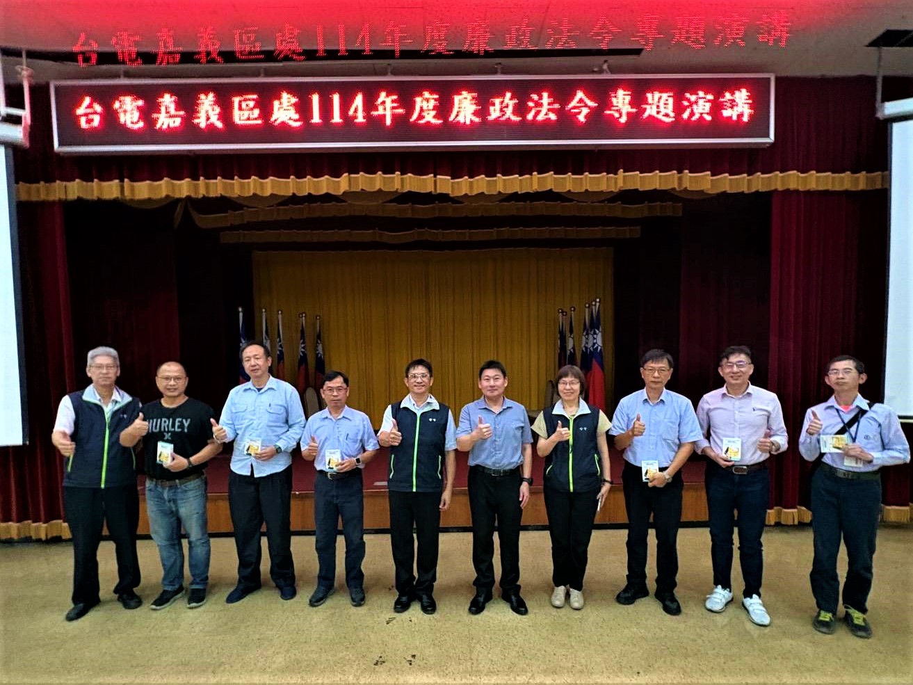 本次專題演講在台電嘉義區營業處禮堂舉行,為將「誠信經營及法令遵循」的原則融入工作DNA,強化行政安全,預防廉政風險,各部門除必要留守人員之外,皆須出席,並安排新進員工參訓,建立應有之公務倫理及廉政法治觀念。許墩貴處長致詞時表示,廉政工作不僅是政府部門的核心價值,亦是企業誠信文化的重要根基,期許同仁在於法有據之下勇於任事,積極主動服務民眾。
