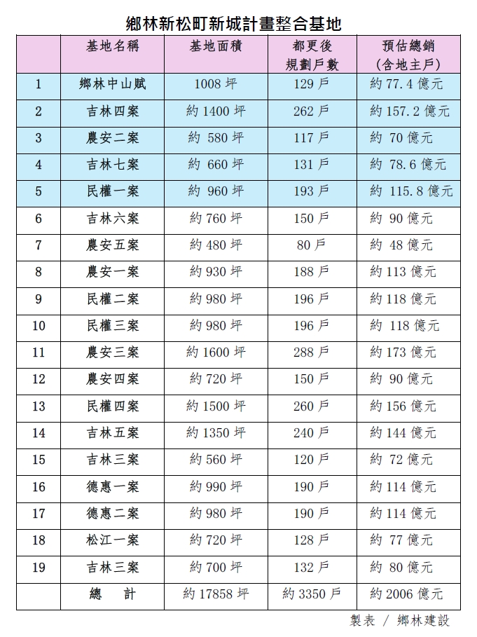 鄉林建設董事長賴正鎰6日宣布,「新松町新城計畫」啟動滿一年,已整合完成19個都市更新案、約2000名地主與1.8萬坪土地,整體進度達16%,估計總銷金額約新台幣2006億元。該案原規劃分六期、歷時15年推動,現因地主參與意願高、整合效率提升,預計最快10年內可完成全區11萬坪整合,成為台北市最大純住宅聚落。
