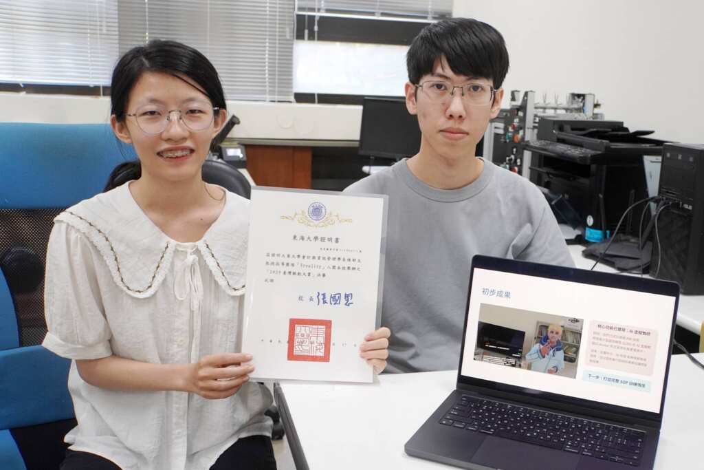 ▲大葉大學會資系研究生陳至楷(右)、陳筳燁(左)榮獲2025臺灣數創大賞佳作。(記者林明佑翻攝)會資系教授陳郁文表示,經濟部產業園區管理局指導,臺中軟體園區發展產學訓聯盟等單位辦理的「2025臺灣數創大賞」,以「數位+」與「智慧+」為主軸,鼓勵青年學子結合AI、物聯網、大數據分析等新興技術,開發具創新性與實用性的智慧應用方案。大葉大學團隊研發的「ImmersiLearn 智慧培訓系統」是結合AI(人工智慧)與XR(延展實境)技術的沉浸式培訓方案,協助產業進行智慧化升級,創新技術整合與實際應用潛力獲得評審肯定,獲得佳作殊榮。