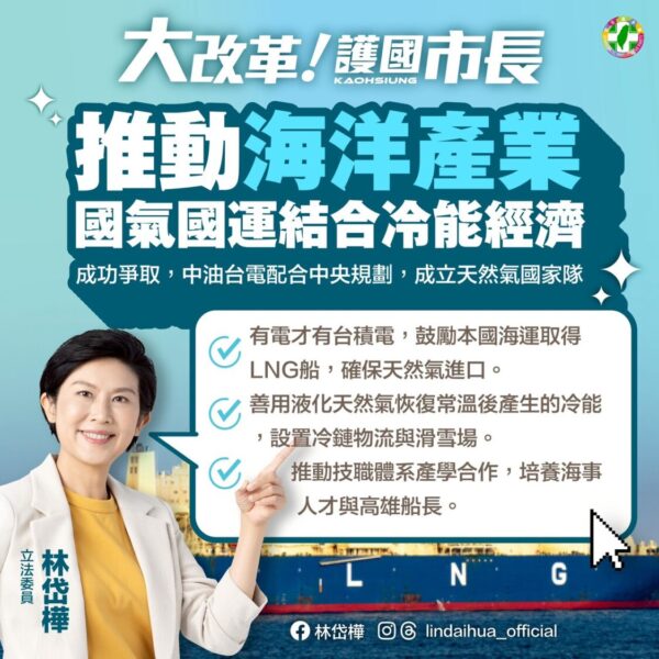 林岱樺提到,高雄是台灣最大的能源進口港,海洋產業加速國氣國運,更要發展冷能經濟。未來將鼓勵本國海運取得LNG船,確保天然氣進口、推動技職體系產學合作,培養海事人才與高雄船長、善用液化天然氣恢復常溫後產生的冷能,設置冷鏈物流與滑雪場。