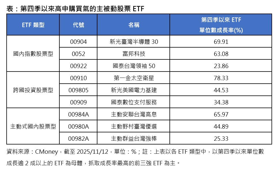 高人氣ETF出列!第四季以來,共有9檔ETF單位數成長逾2成,鎖定的主題包括半導體、科技、太空衛星、電力、數位支付,以及主動式ETF。ˊ