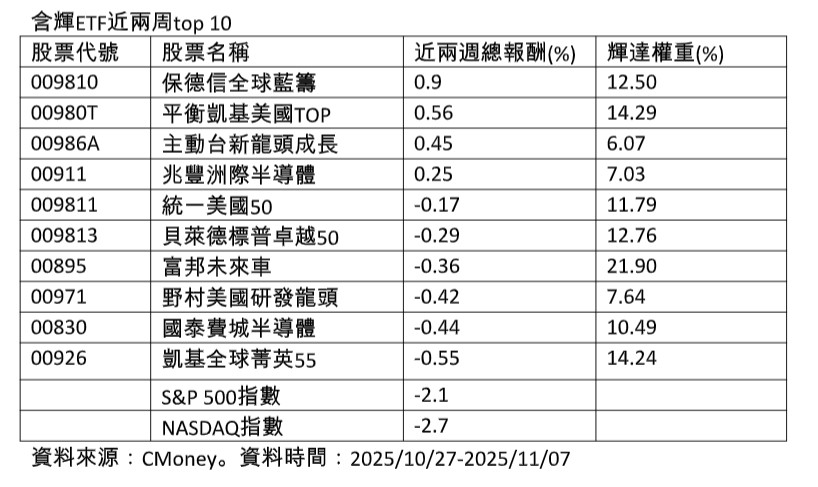 法人指出,AI仍是中長線題材,輝達仍是觀察重點。總計掛牌台股的31檔含輝ETF,保德信全球藍籌(009810)、平衡凱基美國TOP(00980T)、主動台新龍頭成長(00986A),及兆豐洲際半導體(00911)前兩週均維持正報酬,擊敗同期間的標普500指數、那斯達克指數的負報酬。