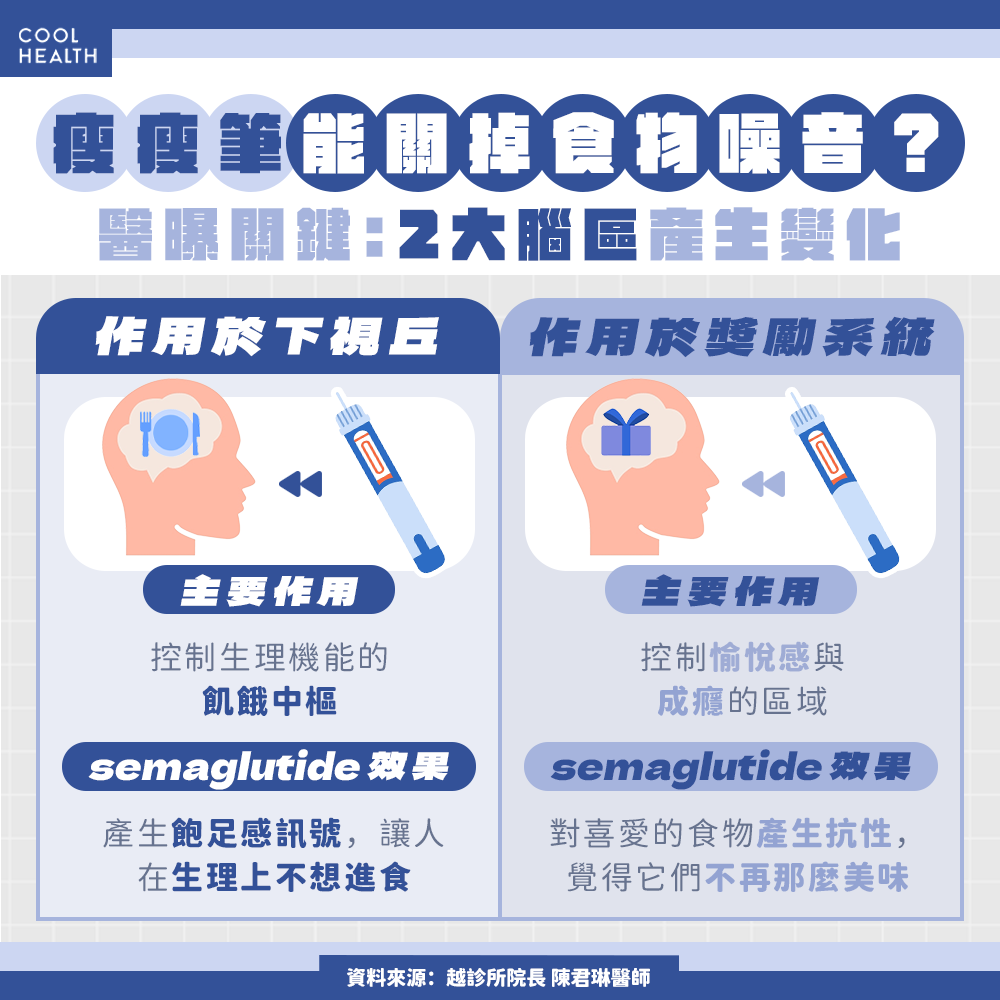 陳君琳醫師表示,2025年歐洲糖尿病研究協會上發表的真實世界調查「INFORM」結果顯示,俗稱「瘦瘦筆」的semaglutide(司美格魯肽,GLP-1類腸泌素針劑),有助於將受試者腦內的食物噪音「強制關閉」。該藥物並非單純讓人「忍飢挨餓」,而是作用於大腦的2個關鍵區域:第一是「下視丘」,為控制生理機能的飢餓中樞,負責調節吃飽以維持生存的基礎生理需求,semaglutide能作用於此並產生飽足訊號。