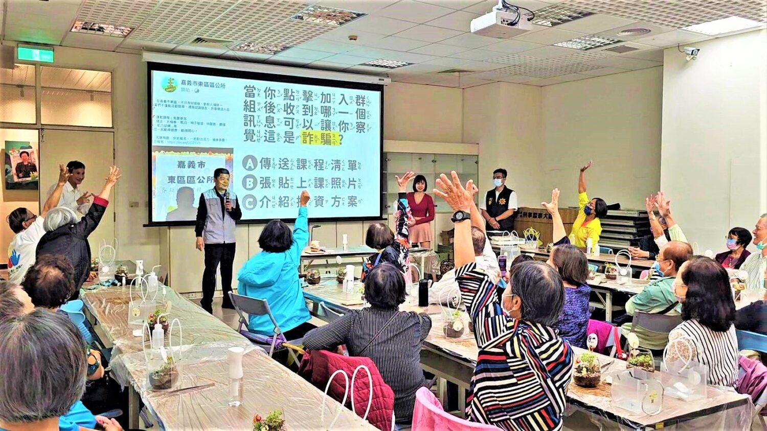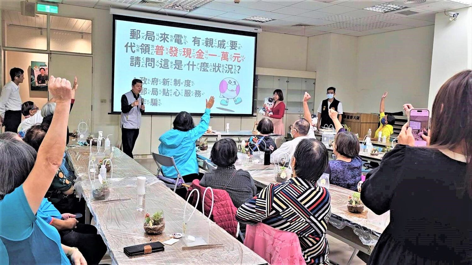 在活動中,嘉義市政府警察局陳明志局長親自分享最新詐騙案例,並特別以「普發現金1萬元」及「假冒公務機關臉書粉絲專頁」等近期熱門詐騙議題進行有獎徵答。長輩們熱情參與、踴躍搶答,現場氣氛熱鬧且學習效果十足,將防詐觀念透過趣味互動深植人心。