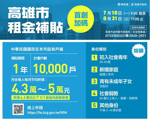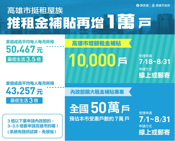 【今傳媒/記者李祖東報導】高雄市增額租金補貼即將開辦!高雄市111年度增額租金補貼申請日期即將於7月18日開始,至8月31日截止,在中央補貼高雄市的7萬戶租屋族群之外,高雄市再加碼補貼1萬戶,總計8萬戶民眾受惠!申請方式因應新冠肺炎(COVID-19)疫情,僅開放線上申請及郵寄申請;補貼金額考量不同地區租金差異及個別家戶負擔程度不同,給予每月1,800~5,880元不等的額度,補貼期間1年;有租屋需求且符合申請資格的民眾請把握時間提出申請!