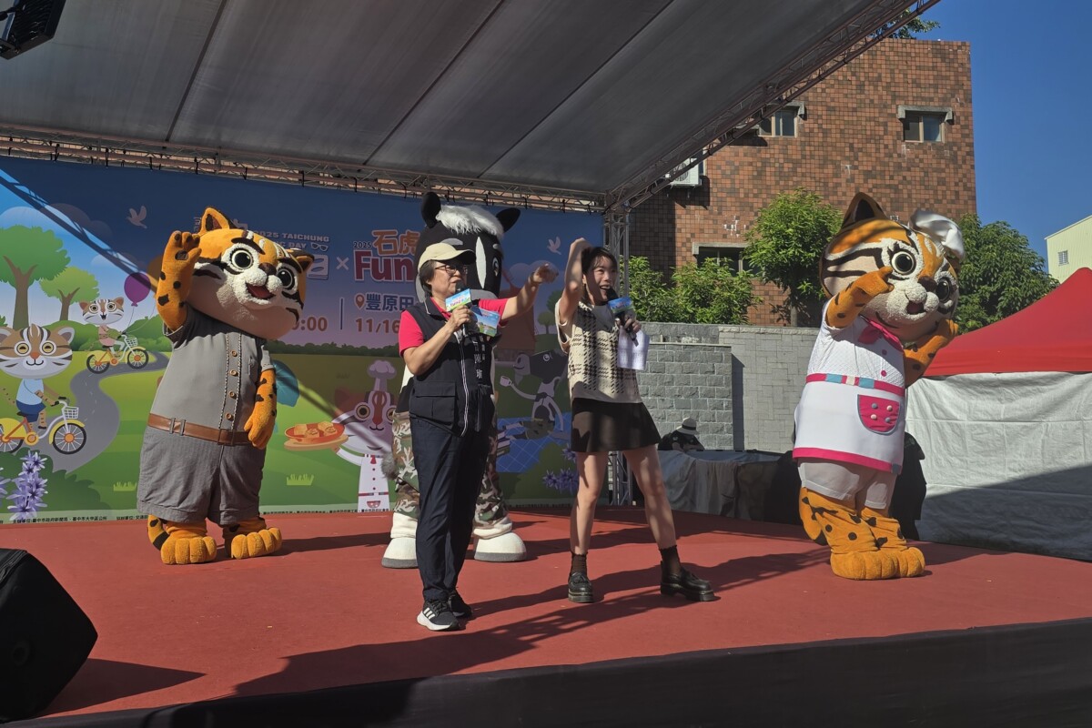 台中市新聞局副局長陳瑜出席活動,與現場民眾有獎徵答互動。(記者廖美雅拍攝)台中市新聞局副局長陳瑜出席活動表示,石虎家族每年都會在台中各區輪流與市民朋友見面,今年共辦理2場見面會,分別是2日的大甲區和今日的豐原區。這次吉祥物見面會在豐原區田心公園舉行,由可愛的石虎家族與歐米馬成員登台熱力表演,並跟現場粉絲朋友互動合照,讓參與民眾留下美好回憶。