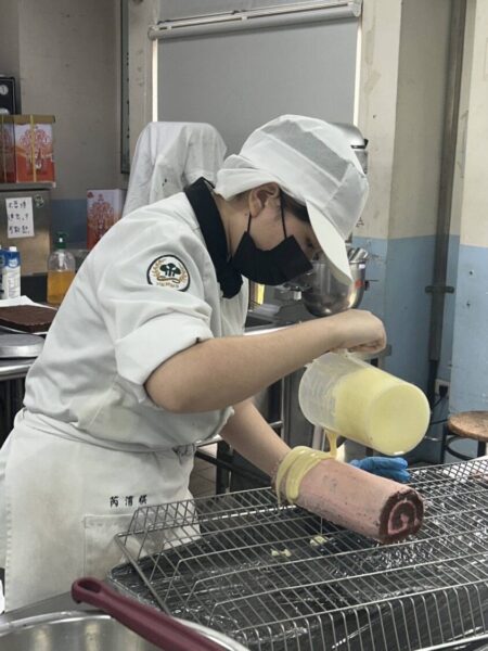 烘焙職種的競賽題目為 「天使蛋糕加起酥片」,製作最具商業價值之產品,需展現蛋白霜處理、烘焙時間掌控、起酥層次與整合技法。芮淯棋 同學以自己設定的穩定節奏完成所有製程,從烘焙計算到蛋白霜打發、麵糊拌合、烘烤、起酥片層層塑形到最後組合,並於規定時間內仍能以奶油霜擠花及蝴蝶巧克力飾片作為裝飾,皆展現平時夜間及週六集訓紮實基礎,以及良好流程管理能力。成品乾淨、美觀、風味純淨,充分表現訓練成果。