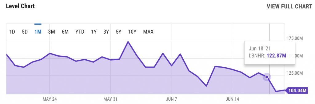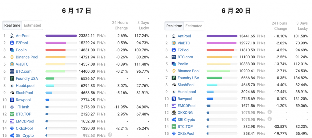 中國當局對加密貨幣礦業的監管對比特幣全網算力造成顯著的影響。中國三大礦區的內蒙古、新疆已在此前因政府打壓而停止挖礦活動。僅存的四川也在 6 月 18 日發布通知,下令關停所有加密貨幣挖礦項目,並於 6 月 20 日前完成清查,當地許多大型礦場已被迫關閉,根據 YCharts 的數據顯示,自消息發布後,比特幣算力下跌了 16.94%。