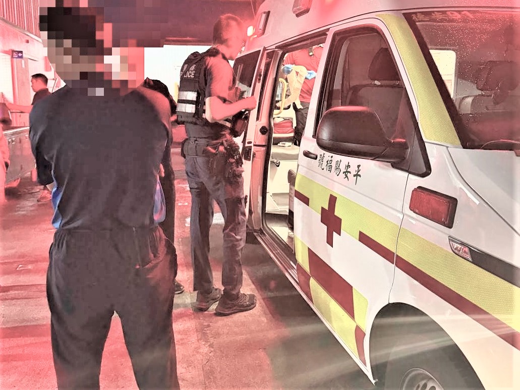 員警趕赴到場,經了解得知為51歲盧姓男子於貨運車搬運物品,工作中未能注意安全,導致身體重心不穩,不慎摔落墜地面,頭部遭鐵架撞擊,所幸同事立即發現後趕緊報案求助,員警急赴到場後與消防救護人員初步檢查,發現盧男身體呈現虛弱無力,血壓過低已有昏迷現象,為確保盧男身體安危確保防止造成二次傷害,急需送往醫院救治。