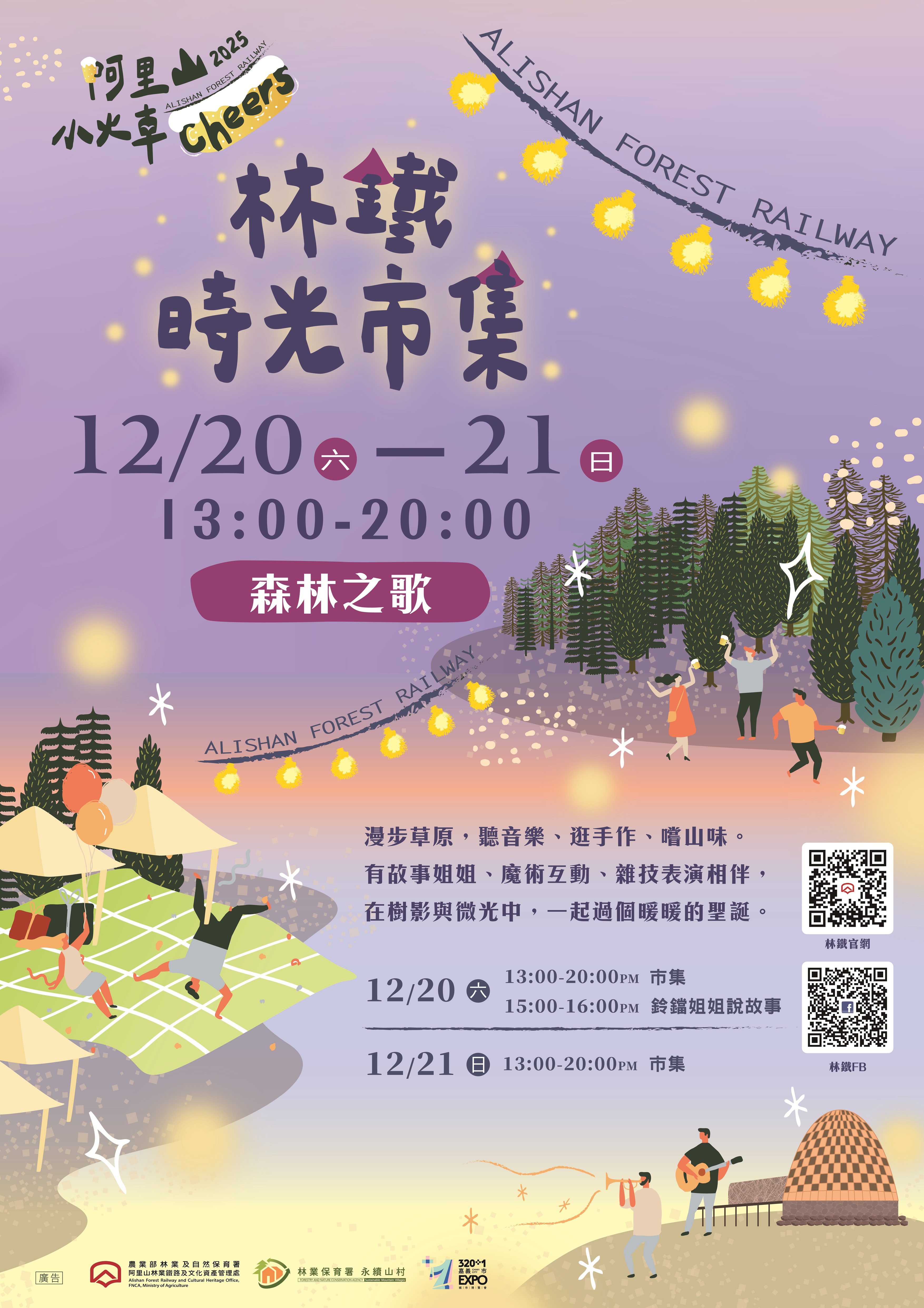 林鐵及文資處於12月20、21日下午1:00至晚上8:00,「林鐵時光市集」限定兩日在阿里山林業村「森林之歌」登場,以鐵路為主題,邀集約30個鐵路沿線優質商家及林業及自然保育署嘉義分署設攤,提供山村部落美食、手作選品和體驗等。森林之歌入口處設置了今年甫發表的高階款列車「森里號」模型供民眾搶先拍照打卡。除了市集,12月20日下午更邀請「FUN星球鈴鐺姐姐」說故事,市集期間還能巧遇阿里山小火車「鐵鹿站長」人偶巡場。