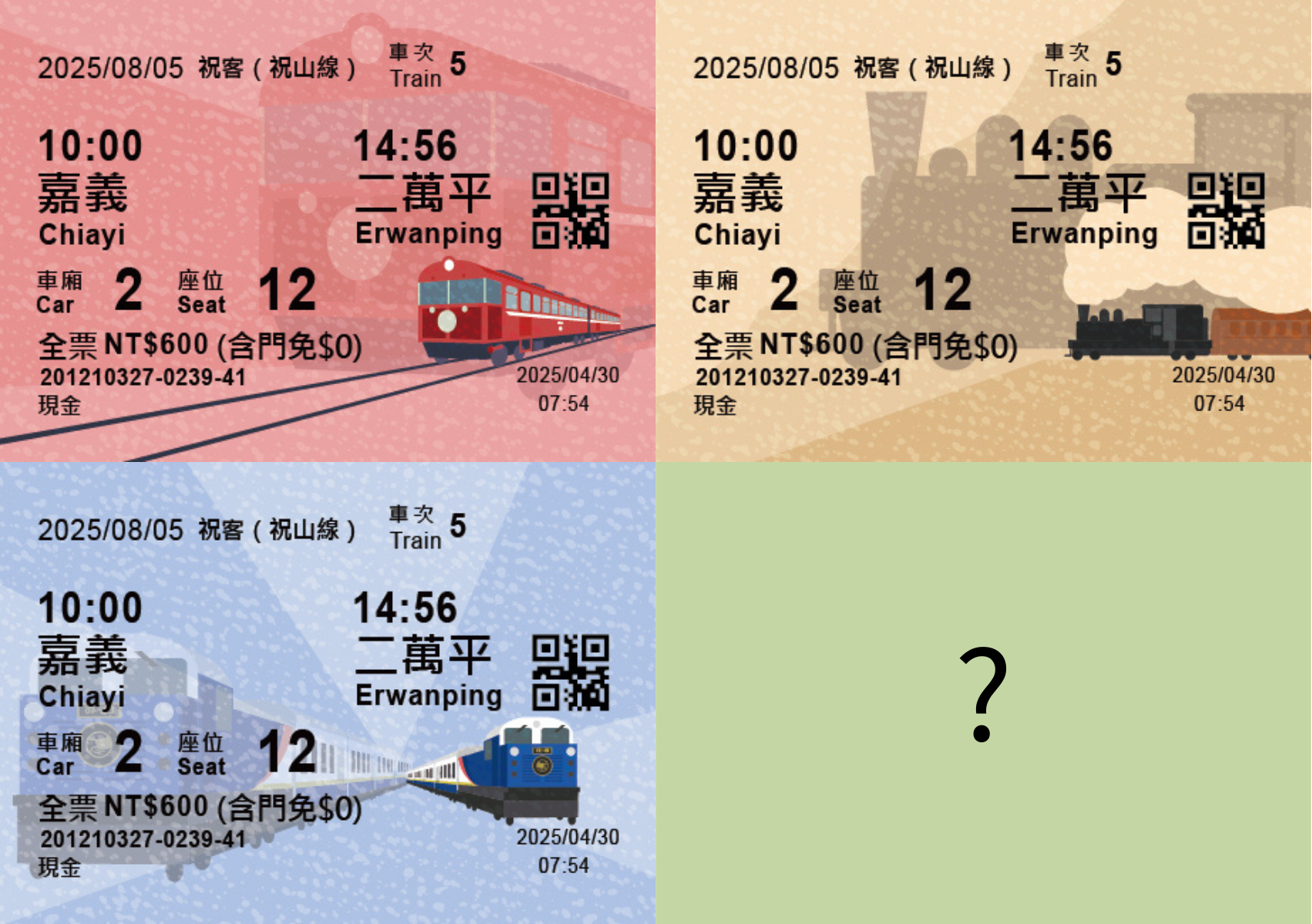 從12月1日起至神木站及祝山站除外的林鐵及文資處各車站購票,搭乘阿里山小火車,即可收藏全新設計「節慶限定款車票」,新車票結合林鐵歷代特色火車,4款票面各為Shay蒸汽火車、中興號、栩悅號及隱藏款,邀請民眾搭乘阿里山小火車收藏4款車票試手氣,幸運的旅客將可獲得限量版隱藏款車票。