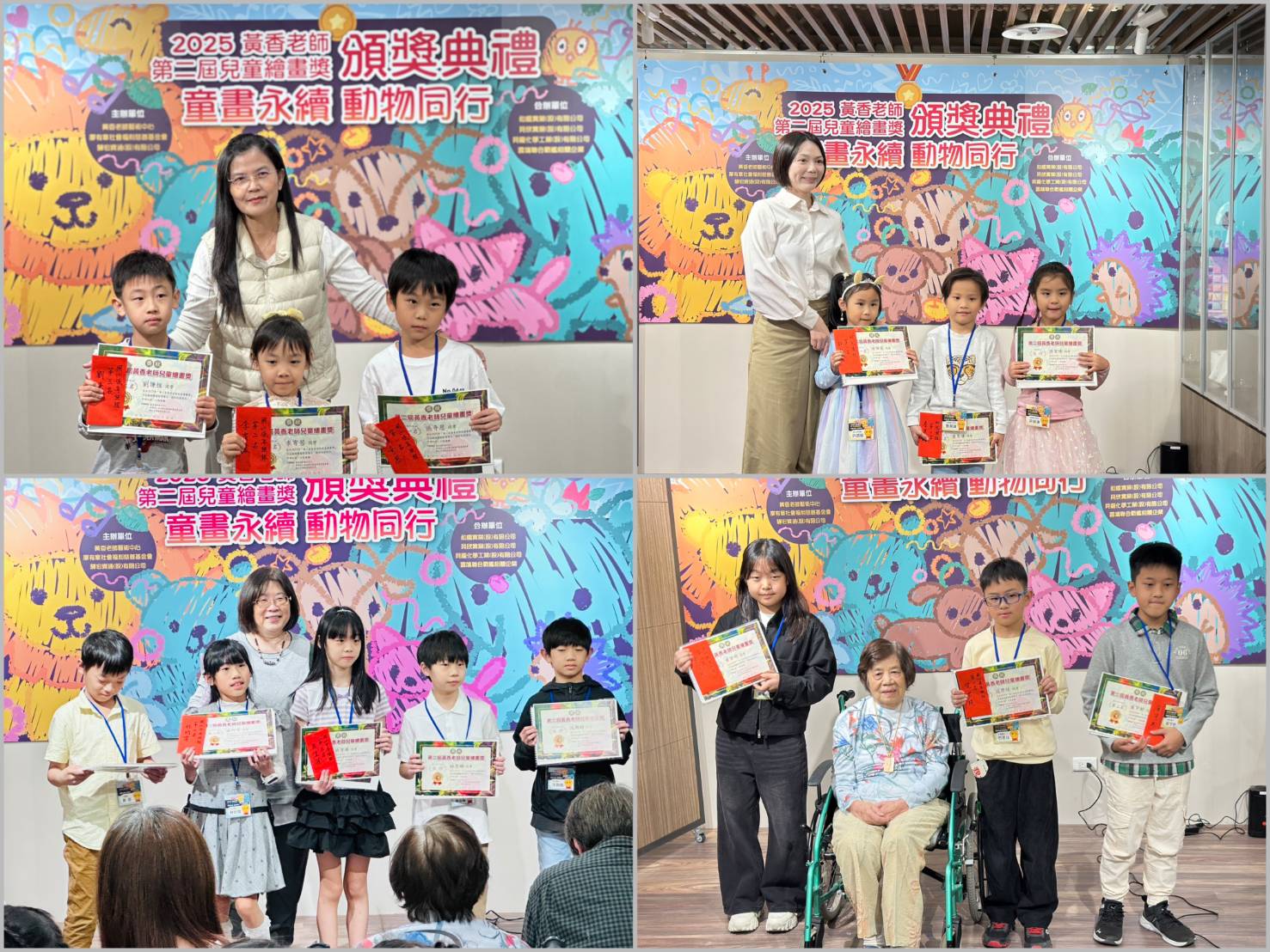 比賽分為幼兒園、國小低年級、中年級、高年級共四組,各組擇優選出前三名及佳作,總計共27位小朋友獲獎,由黃香老師、廖有章社會福利慈善基金會執行長譚守馨、驊宏資通ESG社會關係組組長羅春蘭,以及評審代表蔡沛珊,分別頒發獎狀、獎助學金及獎品給各組的得獎者。