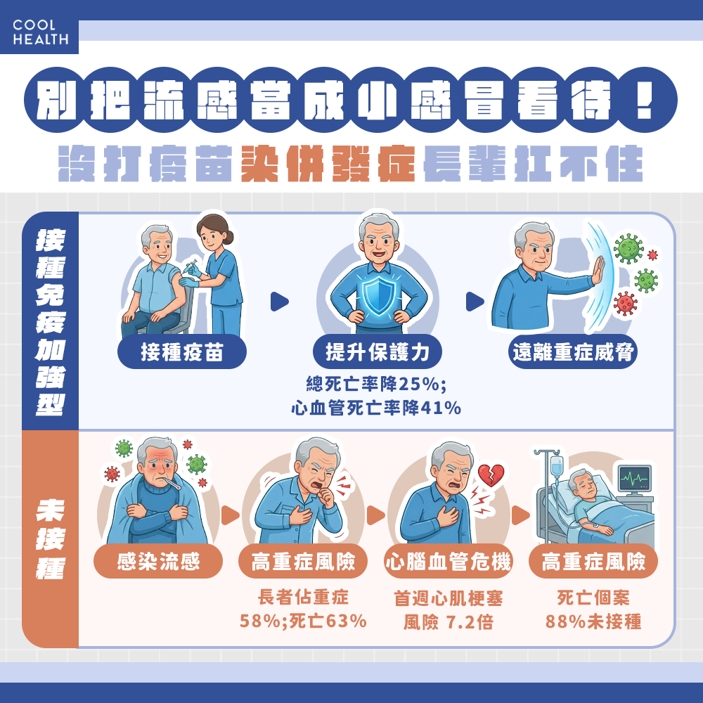 對於有三高或心血管疾病的長輩來說,接種疫苗是保命符。中華民國心臟學會與台灣感染症醫學會共識指出,心血管疾病患者接種流感疫苗,總死亡率可下降 25%;若近期曾發作急性冠心症或穩定型心血管疾病,心血管死亡率更能大幅降低 41%。