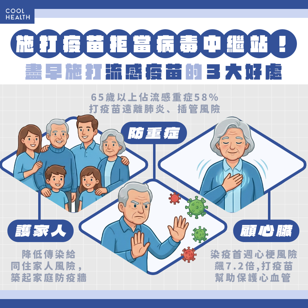 面對流感威脅,醫師呼籲 65 歲以上長者及心血管慢病族群,應破除對副作用的恐懼,優先選擇能克服免疫老化的「免疫加強型疫苗」;無論是透過佐劑疫苗來大幅增強、增廣保護範圍並延長時效,或是選擇高劑量疫苗來誘發強效免疫反應,皆能為長者提供更完善的防護,不僅保護自己的健康,更守護全家人的平安。