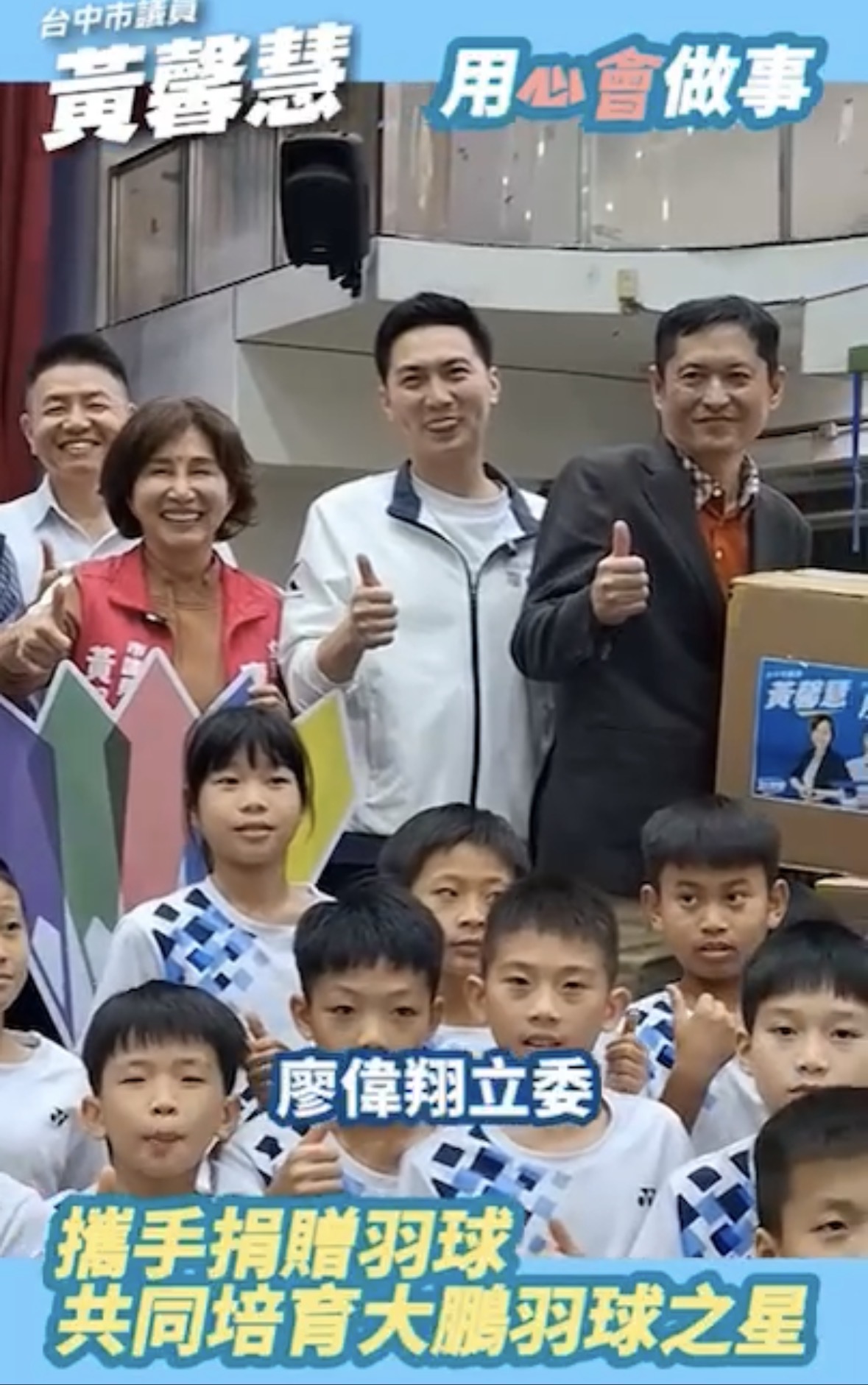 為支持這群用汗水和毅力在場上拚搏的孩子們,臺中市運彩經銷商職業工會(運彩公會)理事長何昱奇,特別與立法委員廖偉翔、市議員黃馨慧共同攜手,捐贈價值 15 萬元、共十箱(3,600 顆)的訓練羽球,希望能為球隊補足日常訓練最重要的「彈藥」,讓孩子們無後顧之憂。