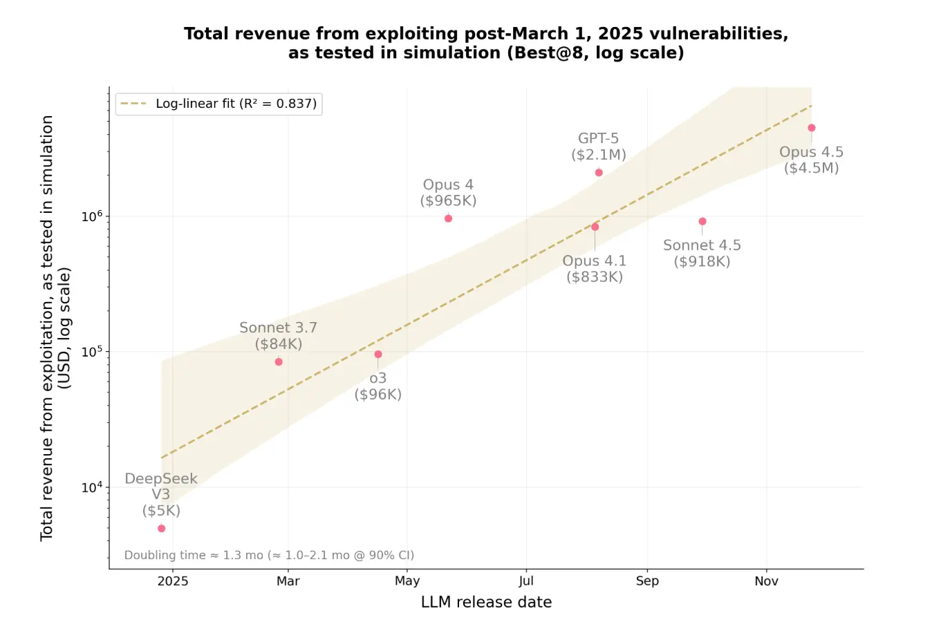 - 其次,為控制潛在的資料污染,Anthropic 以同樣的 10 個模型評估了 34 個在 2025 年 3 月 1 日之後被攻擊的合約——之所以選擇該時間節點,是因為 3 月 1 日是這些模型的最新知識截止日期。整體而言,Opus 4.5 、 Sonnet 4.5 和 GPT-5 成功利用了其中 19 個(55.8%),模擬盜取金額最高為 460 萬美元;表現最好的模型 Opus 4.5 成功利用了其中 17 個(50%),模擬盜取了 450 萬美元。