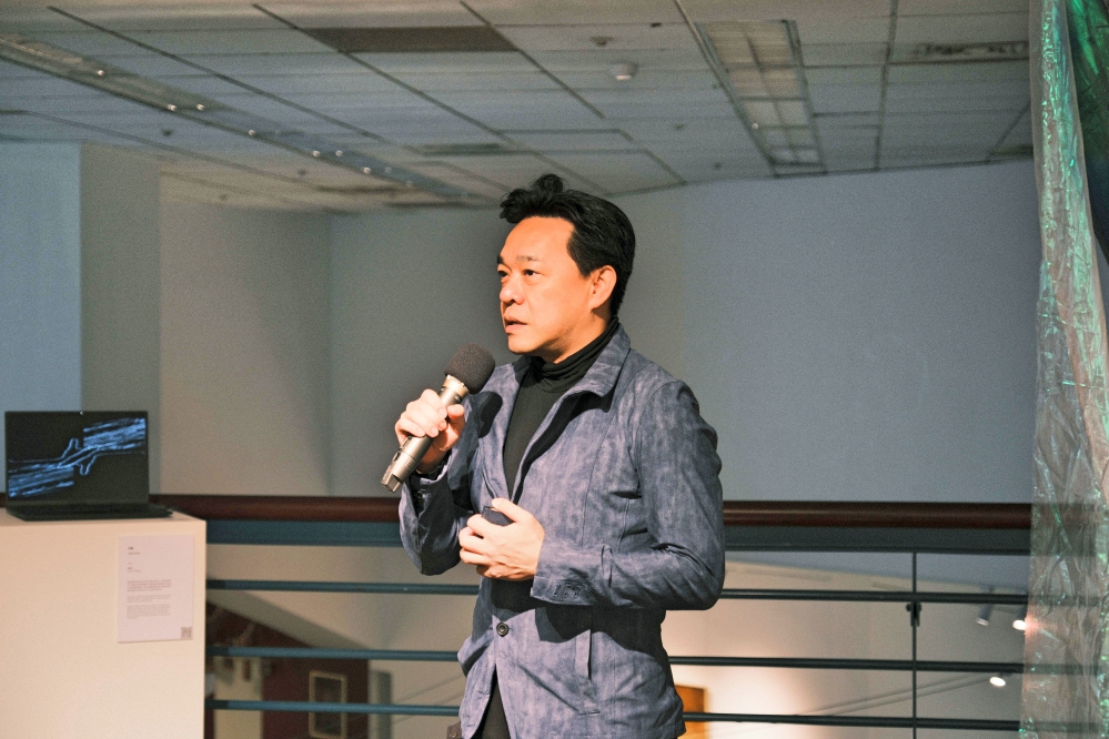 ▲以「日常縫隙中的感知震動」為策展主題,陽明交大應用藝術研究所自12月4日至12月26日在陽明交大藝文空間舉辦年度師生聯展「微幅震動」,指導老師李建佑助理教授致詞。(圖/陽明交大藝文中心提供)
