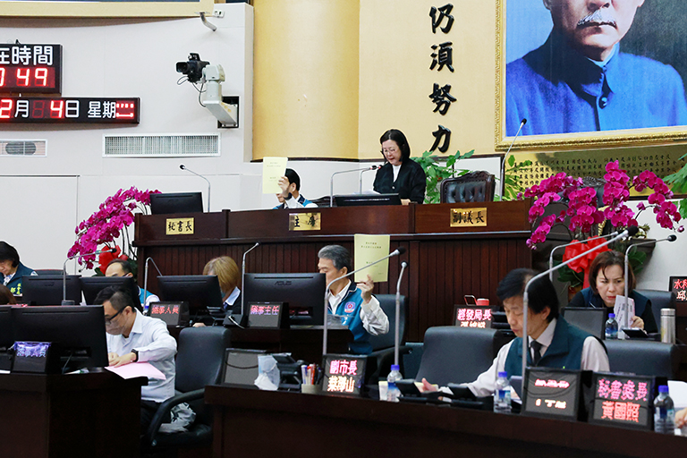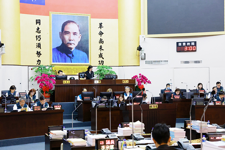 4日大會進行審議各項提案、三讀議案第二、三讀會、臨時動議等議程,黃偉哲市長因出國參訪並行銷本市農特產品向大會請假,由葉澤山副市長代理率市府局處首長列席。