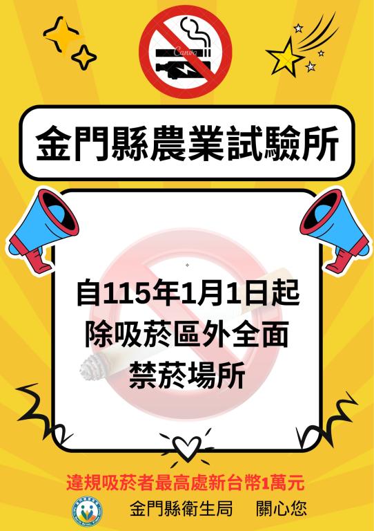 金門縣衛生局指出,為逐步擴大無菸環境,金門縣政府於101年起陸續推動營造無菸環境並公告金門航空站及水頭港埠2處周邊場所為「除吸菸區外全面禁菸」場所、於103年配合衛生福利部公告本縣國家公園及公園綠地計31處無菸環境,並於106年公告27處高級中等學校以下之校園周邊環境(含校門口、家長接送區、周邊人行道及通學步道)」全面禁菸、於107年公告太武山周邊環境包括蔡厝古道、斗門、玉章路三條登山步道計3處為「除吸菸區外全面禁菸」場所、109年公告37處連鎖便利商店、咖啡店及速食店之騎樓及庇廊為全面禁菸場所,112年度公告金門縣林務所計1處為「除吸菸區外全面禁菸」場所,113年度公告金門縣畜試所計1處為「除吸菸區外全面禁菸」場所,今(114)年度公告金門縣農業試驗所計1處為「除吸菸區外全面禁菸」場所目前全縣計有103處公告禁菸場所,希望透過縣府與民間單位共同努力,逐步營造無菸環境,維護縣民身心健康。