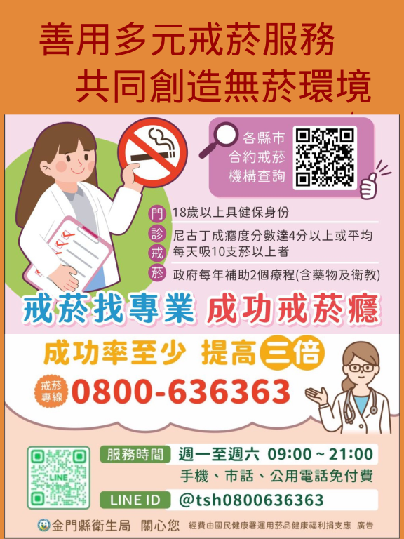 金門縣衛生局提醒,吸菸危害健康,會造成肺部及心血管疾病,也危害身邊家人,呼籲吸菸者及早戒菸,多加利用本縣二代戒菸合約醫療院所,接受戒菸治療、戒菸衛教諮詢或利用免費戒菸專線「0800-636363」,由專人幫助脫離菸癮,及早成功戒菸,重拾健康。(金門縣政府提供照片)