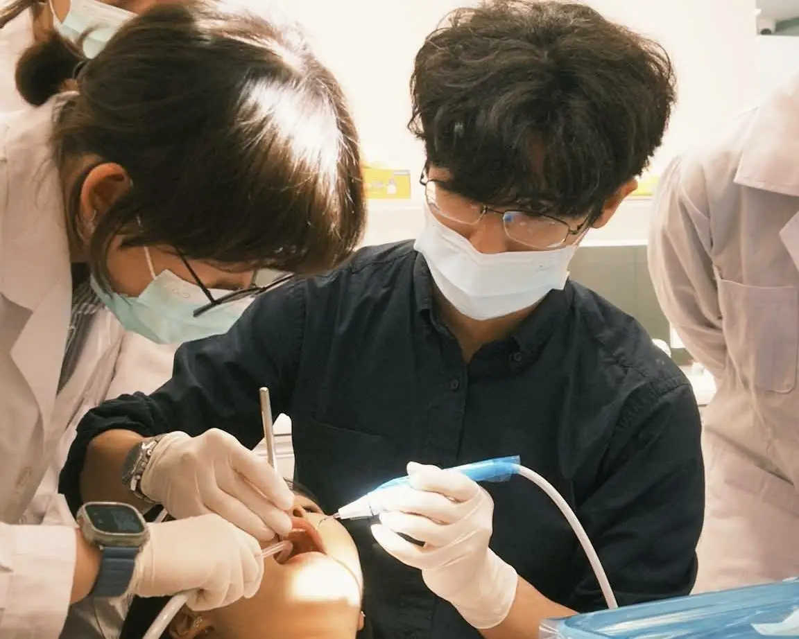 張承鎧醫師則帶領學生進行窩溝封填與視野控制訓練,透過雙人互做與分組實作,讓學生熟悉器械拿取、治療動線、燈光與醫師視角的配合方式,練習在小小的口腔空間中完成穩定操作。