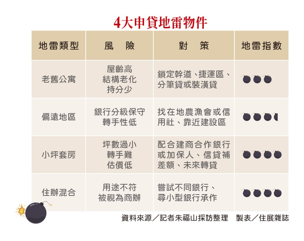 台北市不動產估價師公會理事長鐘少佑分析,銀行放貸時會同時評估申貸者的還款能力、收入結構與信用紀錄,以及擔保品的流通性與價值穩定度。若兩者其一出現疑慮,就可能被列入「地雷戶」。本刊透過房市專家觀察,盤點四大地雷型物件,並提出對策,協助讀者避開風險。