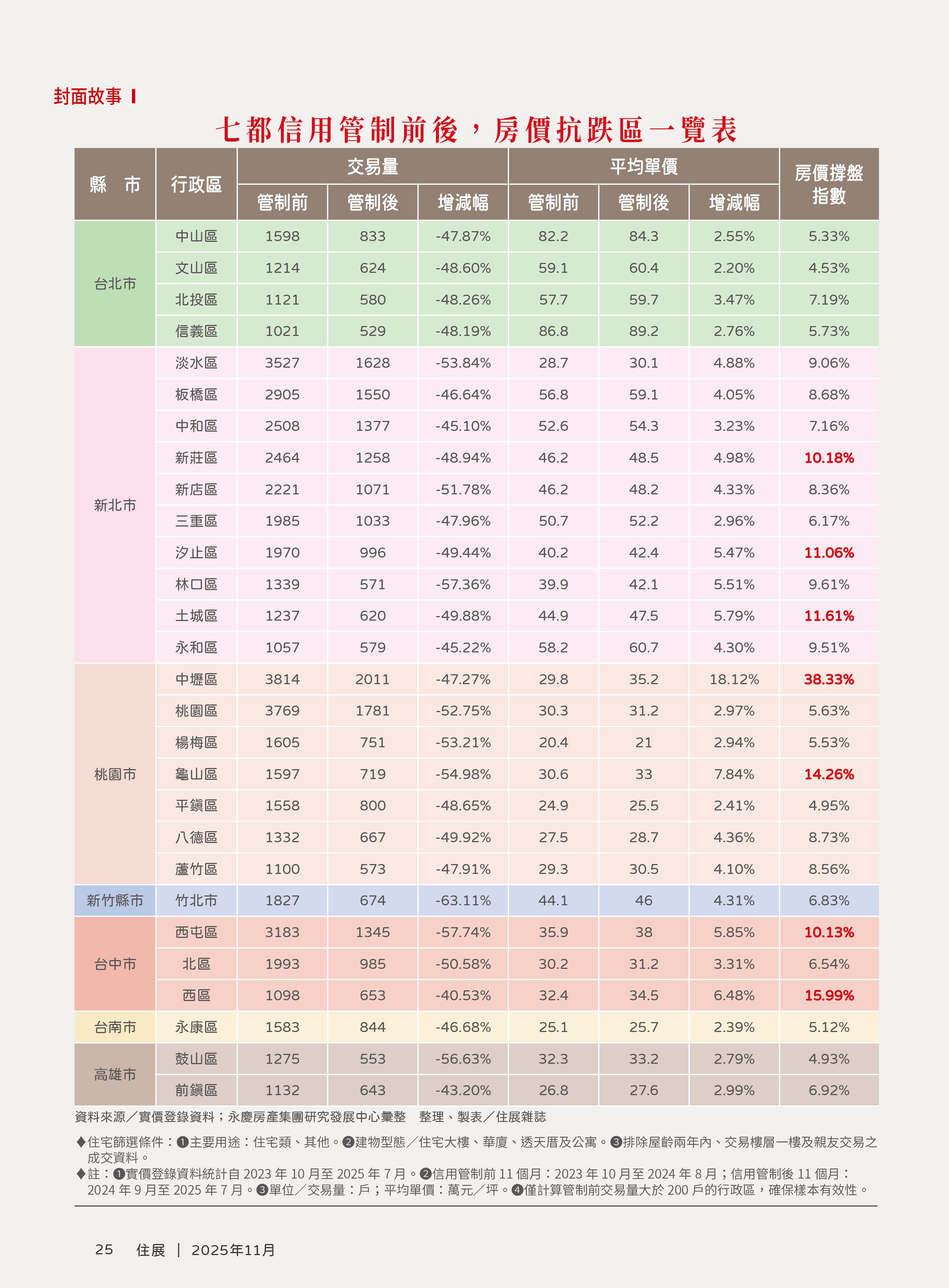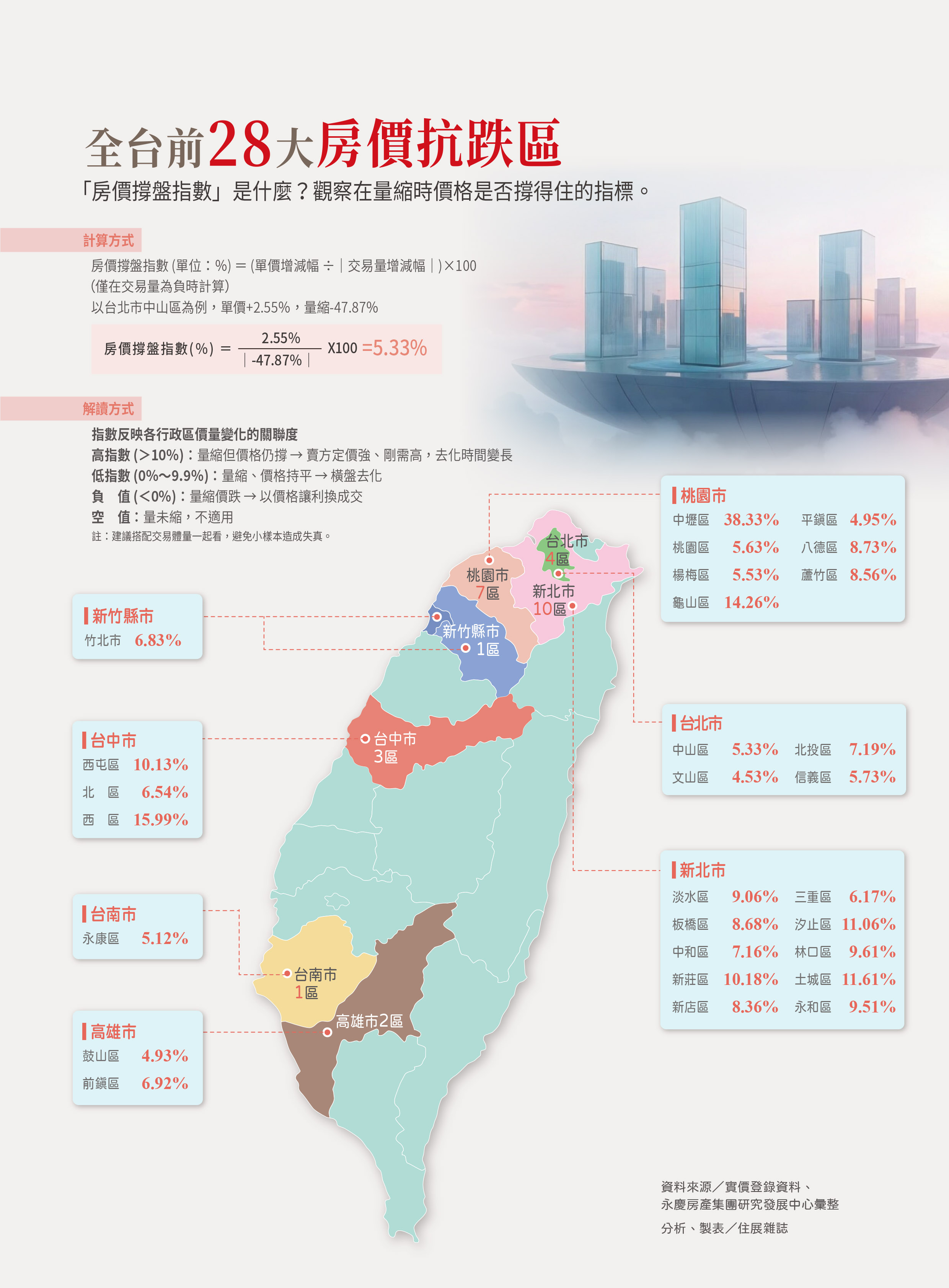 根據統計後數據,《住展》盤點出七都28個房價抗跌行政區,這些行政區共同特點是,在交易量明顯縮水時,價格仍能撐住甚至上漲,顯示區域內賣方定價能力及剛性需求皆較強,同時也意味庫存風險上升且去化時間延長。