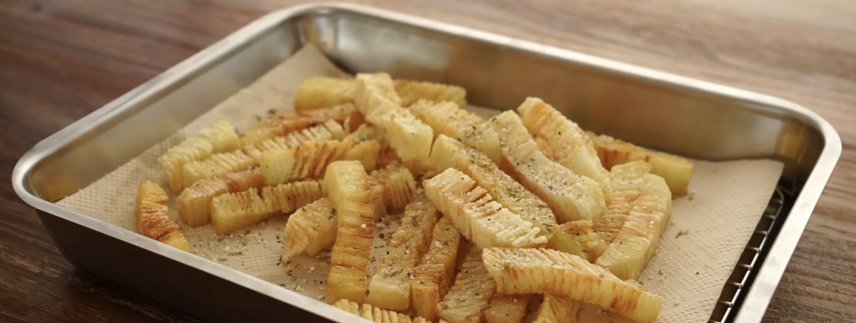 做法其實很簡單又有趣。先把馬鈴薯剝皮、切成厚片,再在兩側插上木簽,避免切斷,接著一面直切、一面斜切,就能做出像手風琴般層層疊起的造型。切好的薯條先泡水去除多餘澱粉,再瀝乾、裹上玉米澱粉和少量油,這一步決定了薯條的酥脆度,讓外層金黃酥脆、內層依然綿密。