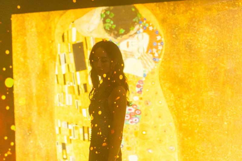 展區以沉浸式多媒體技術重現克林姆的創作視角,讓觀眾宛如置身於他的靈感世界。克林姆創作風景畫時,習慣用望遠鏡凝視自然,將遠方景緻拉近,捕捉肉眼難以察覺的光影變化與細節。展場借助群創光電贊助的數位畫框技術,將這份「克林姆式凝視」具象化,3D立體與仿真畫作質感的融合,營造出虛實交錯的視覺體驗。每一處光影、每一絲筆觸,都彷彿在眼前鮮活流動,讓人不僅是欣賞藝術,更像是與大師一同「看見」自然的秘密。