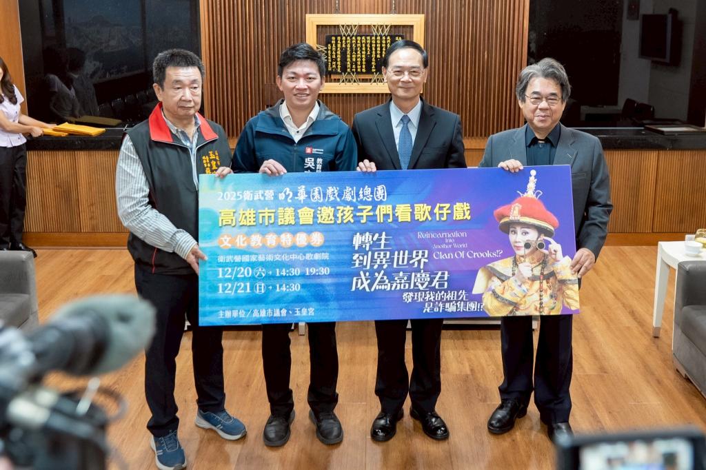 【大成報記者張淑慧/高雄報導】高雄市議會積極扮演藝文推手角色,促成高雄玉皇宮捐贈396張文化教育券,今(5)日於市議會舉行贈票儀式。高雄市議會秘書長黃錦平宣布,將邀請全市11所高中師生走進衛武營國家藝術文化中心,欣賞明華園戲劇總團結合時下流行「異世界穿越」元素的年度大戲,讓文化教育走出課本,以最貼近年輕世代的方式認識傳統藝術。