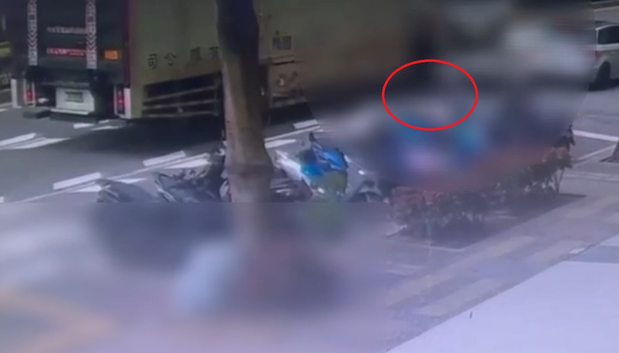 騎機車77歲婦人(紅圈處)遭大貨車撞倒輾過傷重不治。翻攝畫面