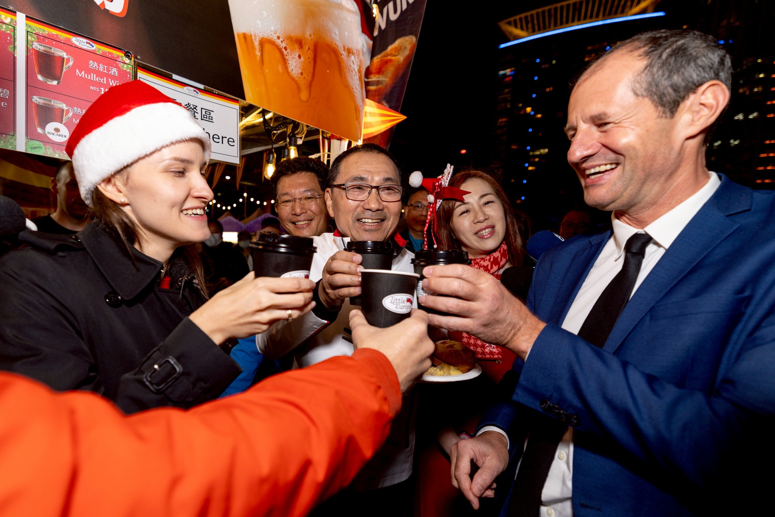 ▲ 新北市市長侯友宜、德國經濟辦事處、歐洲經貿辦事處、議會團隊及市府團隊等多位貴賓齊聚進行主燈新秀暨德國耶誕市集開幕儀式,並巡攤品嚐德國道地美食與咖啡。(圖/新北市政府觀光旅遊局)