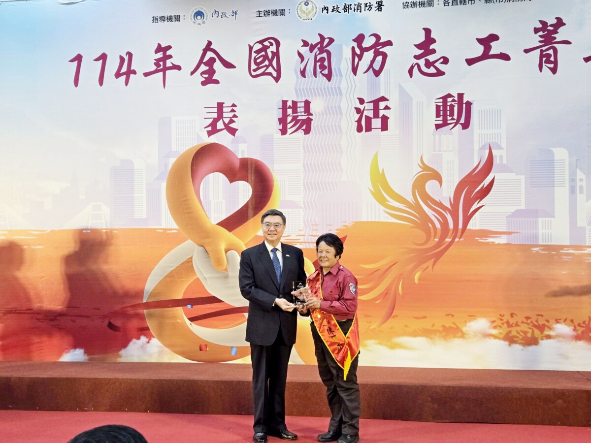 【記者 洪美滿/金門 報導】為激勵全國消防志工、義消及提升防火防災正面能量,建立「全民消防」概念,以表彰消防志工、義消對消防之貢獻,消防署在國際志工日(12月5日)特辦理「114年全國消防志工菁英頒獎表揚活動」。本縣今年由義消總隊第三大隊金城防宣分隊副分隊長陳錦秀、第四大隊助理幹事李銘欽脫穎而出,勇奪兩項志工最高榮譽;此外,資深義消林登寶亦獲頒服務滿40年資深義消殊榮。由消防局秘書陳叁奇代表局長呂英華,率隊前往消防署參加頒獎表揚活動,共同見證金門防宣與救護志工的榮耀時刻。