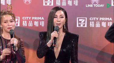 今年金曲紅地毯最大亮點,壓軸請來最美麗歐巴桑陳美鳳,走在紅毯上,穿著一襲黑色長禮服的陳美鳳,突然脫下黑色的外套,現出深V領,隱隱若現,全場驚艷!