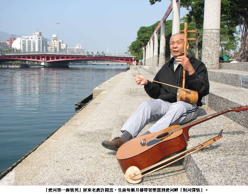 高雄愛河的故事多如肉粽串,隨便撈起一條線,都是一段動人心弦的愛情故事,但有例外,這故事的男子角是屏東一位年逾古稀的老農許開忠,生前每個月固定背著吉他及二胡騎機車到愛河「對河彈情」,他自彈自唱,自得其樂,晚近數年,消失無影,經過追蹤,這位「愛河第一痴情男」已辭世,空留「老農月月會愛河」的身影。