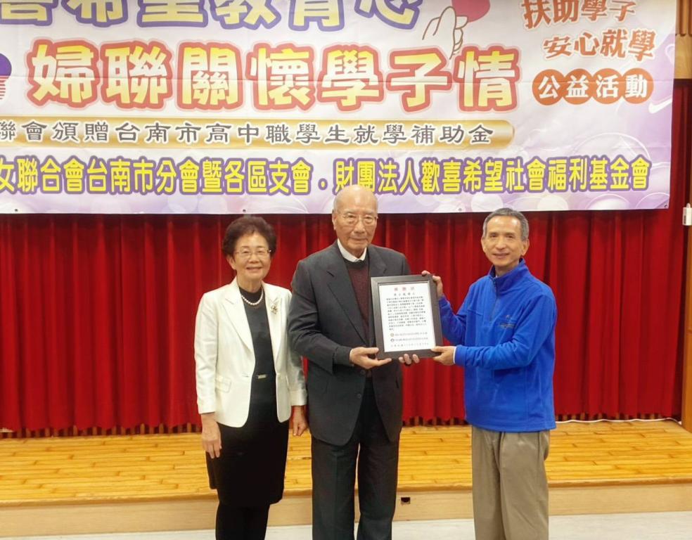 【勁報記者于郁金/臺南報導】中華民國婦女聯合會與財團法人中華民國婦聯社會福利基金會為協助清寒弱勢家庭孩子安心努力向學,14日上午假新營高中,頒贈臺南市轄內25校之39位高中職學生就學補助金,每人1萬元;頒贈儀式係由婦聯會臺南市分會與歡喜希望社會福利基金會攜手辦理;歡喜希望社會福利基金會則捐款5萬元給新營高中「教育儲蓄專戶」,共同為扶助弱勢學生,確保安心就學略盡綿薄。