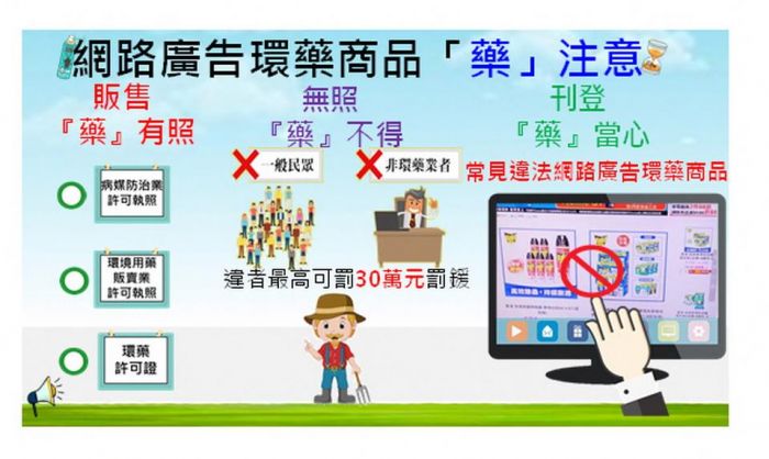現今電商通路平臺網路購物或拍賣相當便利,有些民眾為了賺外快,趁著防蟲旺季會在網路平臺廣告販賣造型可愛的防蚊掛片、防蚊手錶、包裝新穎的蟑螂藥、防螨藥,但是一般民眾並無環境用藥相關許可證,上網廣告拍賣的行為恐將觸法。依環境用藥管理法第32條規定「非持有環境用藥許可證、環境用藥販賣業或病媒防治業許可執照,不得為環境用藥廣告」行為,違者依環境用藥管理法第48條規定最高可處30萬元罰鍰。另外,對於民眾自國外帶回防蚊貼片等商品,因國外環境用藥未具環保署審核許可,依法僅限自用,如上網拍賣,同樣也是屬於違法行為!
