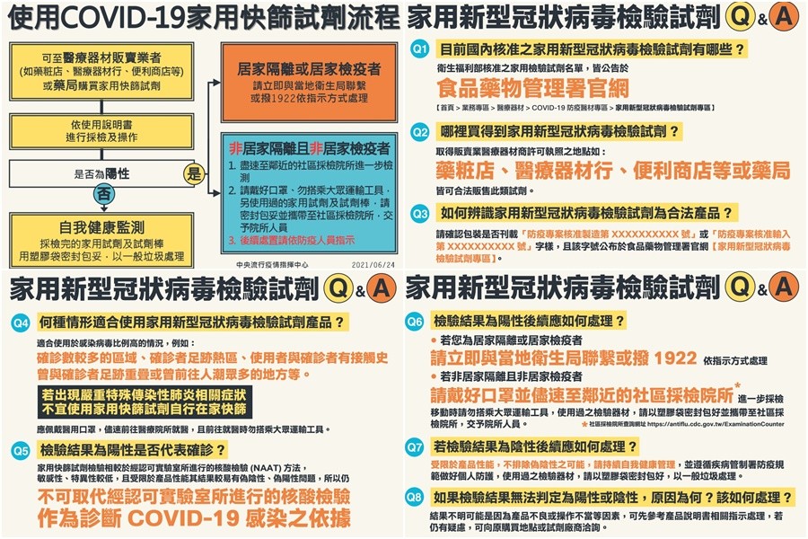 「民眾使用COVID-19家用快篩試劑指引」已於6月19日公布。中央流行疫情指揮中心為使民眾居家正確自行檢測,24日再次提醒民眾使用家用快篩試劑相關流程與注意事項。